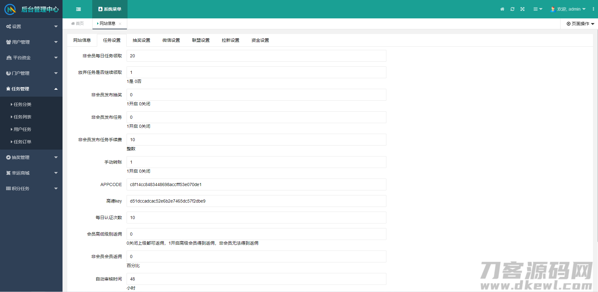 任务设置:包含非会员每日领取设置、放弃任务领取功能设置、任务审核时间后台自定义设置、普通用户任务返佣设置。
